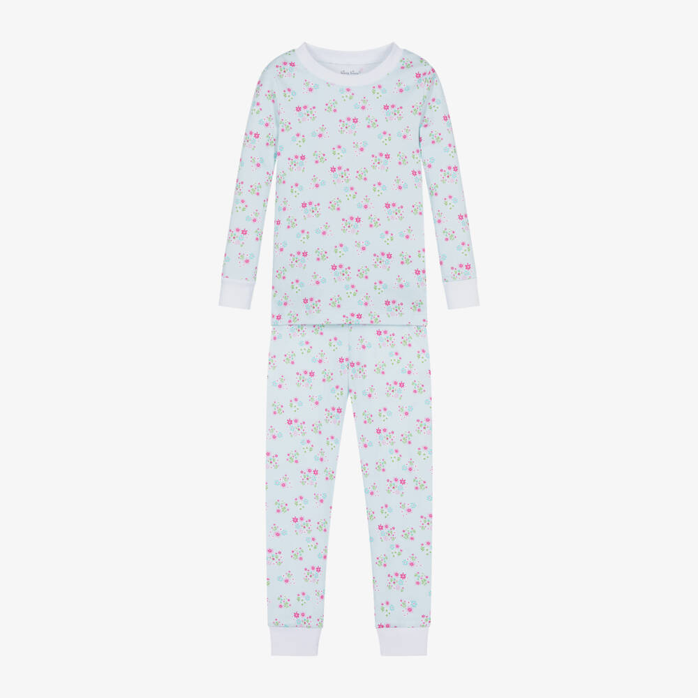 Gorgeous pale blue long pyjamas for girls by Kissy Kissy, made in beautifully soft and comfortable Pima cotton jersey. They are patterned with a charming floral design in pink, blue and green. Both pieces have cosy, white ribbed trims and the bottoms have a gently elasticated waist for a comfortable night's sleep.