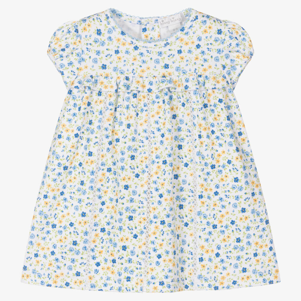 White dress for baby girls by Kissy Kissy, with a pretty blue and yellow floral print on a white background and blue picot trims. Made in super soft and comfortable Pima cotton jersey, it has pretty puffed sleeves, a frill across the bodice and cross-stitch detailing on the skirt. It fastens with easy-to-use poppers around the back and comes with useful bloomers that have gently elasticated, frilled cuffs.