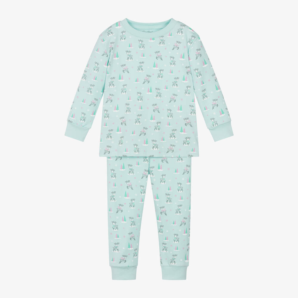 Turquoise blue long pyjamas for girls by Kissy Kissy, made in super soft and stretchy Pima cotton jersey. For a fun festive look, they have a cute print of reindeer playing in the snow. They have cosy ribbed trims and the bottoms have a comfortable elasticated waist.