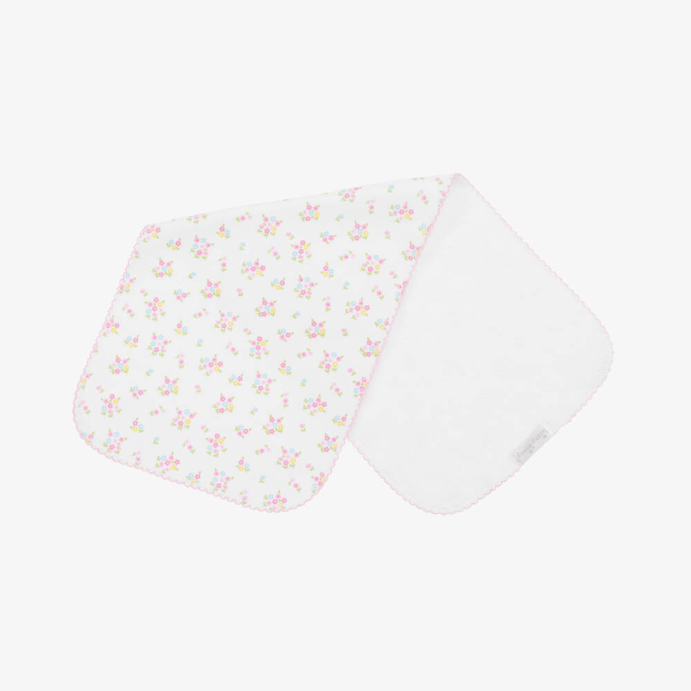 Pretty white burp cloth for baby girls by Kissy Kissy, made in super soft Pima cotton jersey. It is patterned in a colourful rainbow and ditsy floral design, with picot embroidery trim. Lined in absorbent cotton towelling, it is useful for placing over the shoulder when burping baby after a feed.