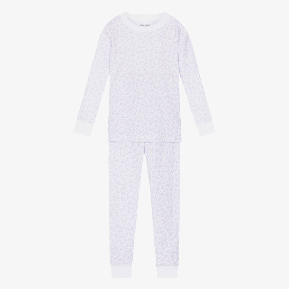 Patterned with a beautiful lilac floral print, a pair of white Pima cotton pyjamas for girls by Kissy Kissy. Snug-fitting, they are made in super soft and comfortable jersey, ideal for a good night's sleep.