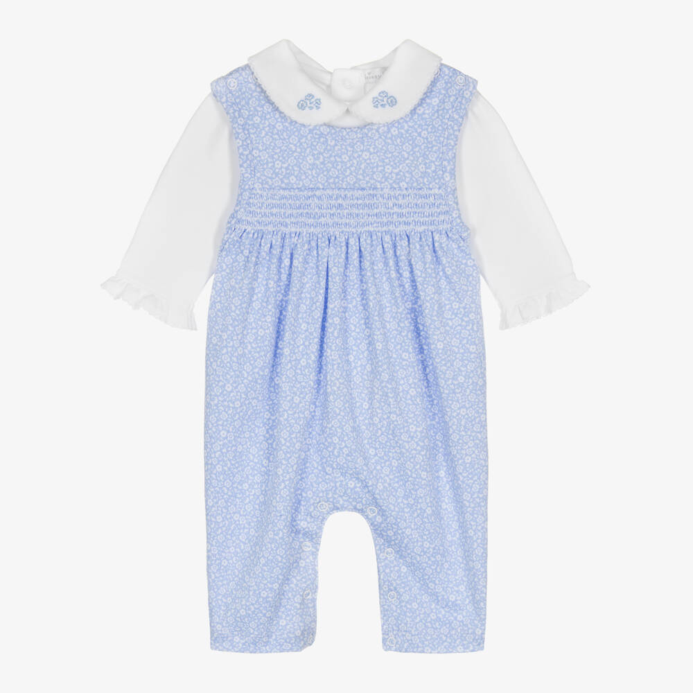 Lovely blue and white babysuit set for baby girls by Kissy Kissy, made with beautifully soft and stretchy Pima cotton jersey. The blue dungaree romper has a sweet white flower pattern and a shirred panel across the front for a timeless look. The bodysuit has blue flowers embroidered on the rounded collar and pretty frilled cuffs on the long sleeves. Both pieces fasten with practical poppers.