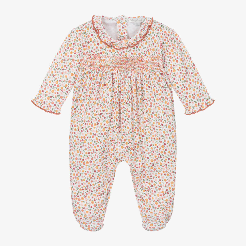 A traditionally styled white babygrow for girls by Kissy Kissy, with a ditsy floral print in lovely autumnal shades of orange, pink and terracotta brown. Made in super soft and comfortable Pima cotton jersey, it has a shirred panel across the front and delightful ruffle trims edged in brown embroidery. There are popper fastenings on the back and between the legs.