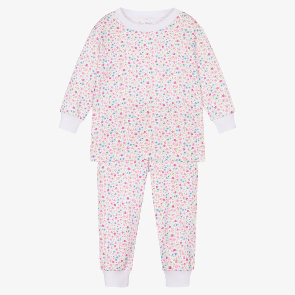 White pyjamas for girls by Kissy Kissy, with a pretty pink and blue flower print on a white background. Made in super soft and comfortable Pima cotton jersey, they have white ribbed trims for extra cosiness. The trousers have a gently elasticated waist for a comfortable fit on little tummies.