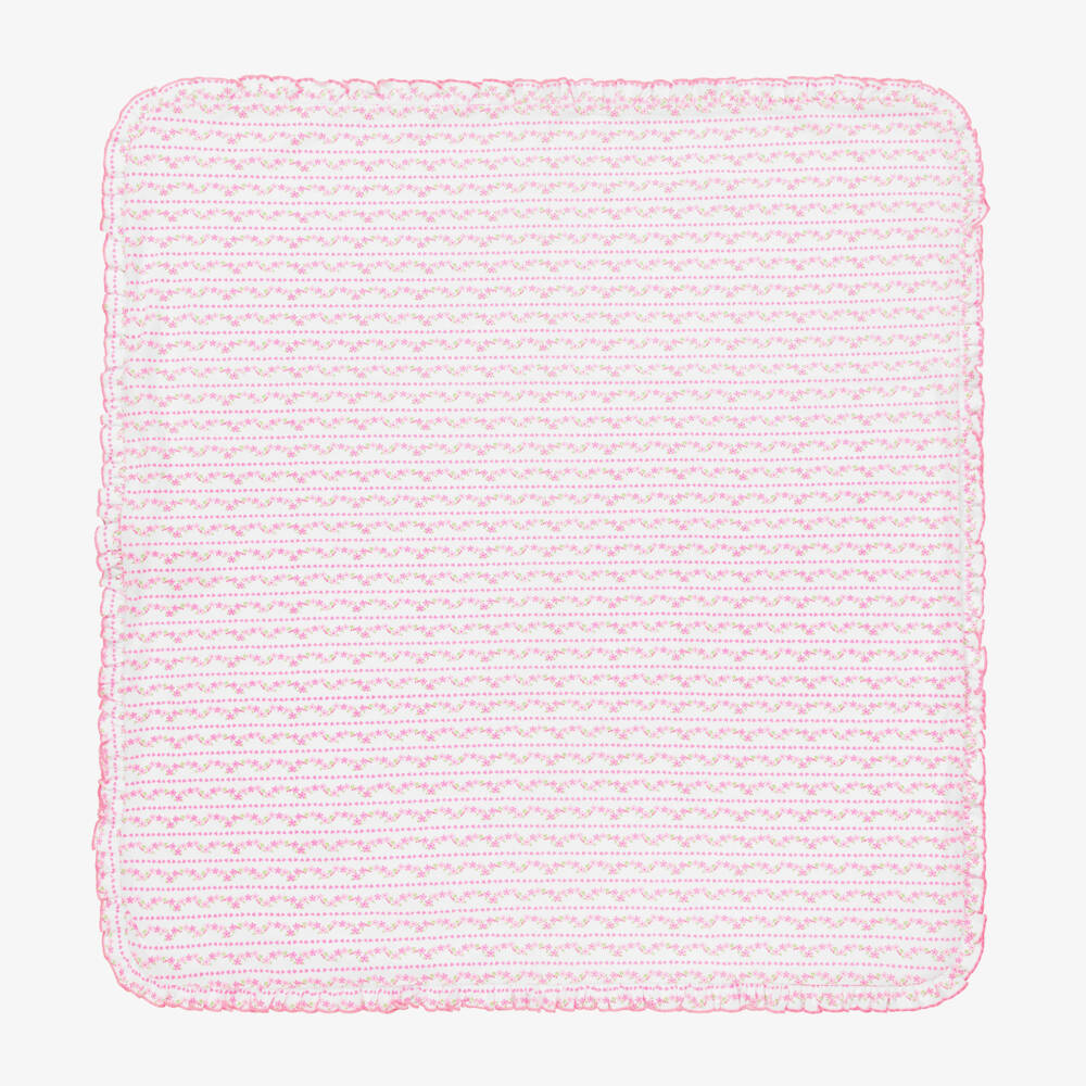 White floral blanket for baby girls by Kissy Kissy, made in a double layer of super soft Pima cotton jersey. With a cute pink ditsy floral print on one side, it is plain on the reverse and has a frilled trim, edged in pink. A versatile nursery accessory, it can be used to wrap around baby or when out and about in the pram or car seat.