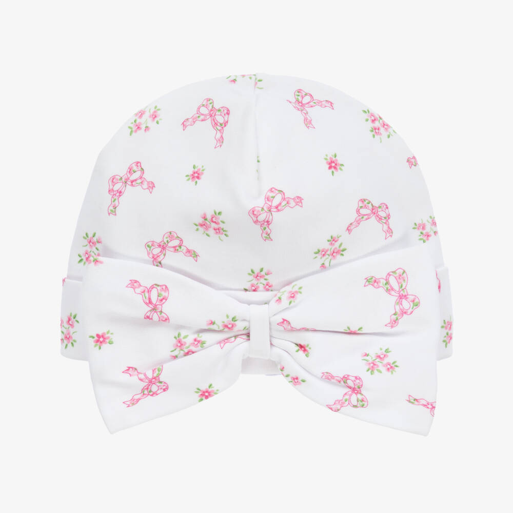 A white and pink hat for baby girls by Kissy Kissy, with a delicate bow and floral print. Soft and comfortable in a double layer of Pima cotton jersey, the style is complete with a stitched bow on the front.