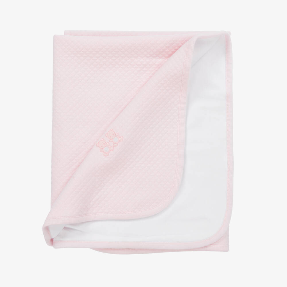 A sweet pink blanket for baby girls by Kissy Kissy, made from soft cotton jersey. The pink side has a lovely quilt-inspired diamond pattern with cute teddy bears embroidered on one corner for an adorable finish. The reverse is plain white. Ideal for use in the car seat or stroller, this cute blanket also makes an attractive nursery accessory.