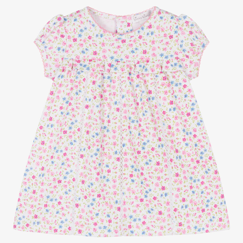 White dress for baby girls by Kissy Kissy, with a pretty pink and blue floral print on a white background and pink picot trims. Made in super soft and comfortable Pima cotton jersey, it has pretty puffed sleeves, a frill across the bodice and cross-stitch detailing on the skirt. It fastens with easy-to-use poppers around the back and comes with useful bloomers that have gently elasticated, frilled cuffs.