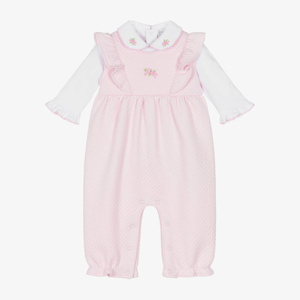 A charming white and pink babysuit set for baby girls by Kissy Kissy. Gentle on delicate skin, both pieces are made in super soft Pima cotton jersey, with practical popper fastenings. The bodysuit has frilly cuffs, picot embroidery trims, and pretty embroidered roses on the collar. The sleeveless romper has a classic quilted effect, with lovely ruffle trims and embroidered roses on the chest.