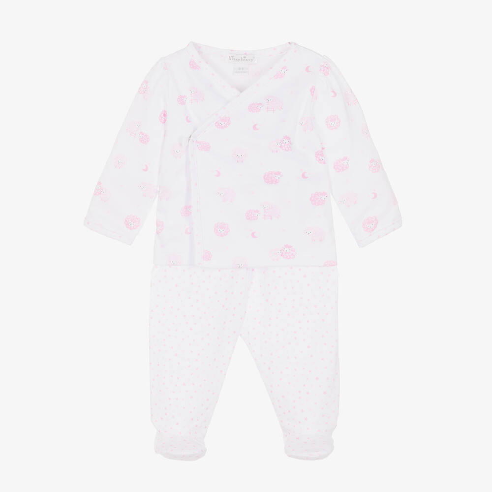 White two piece babygrow for girls by Kissy Kissy, made in super soft, stretchy Pima cotton jersey. The puffed sleeve top is patterned with cute pink sheep and has a crossover front fastening with poppers. Smaller sizes have fold-over scratch mitts. The bottoms have a lovely pink star print and an elasticated waist for comfort.