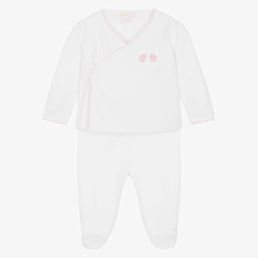 White two piece babygrow for girls by Kissy Kissy, made in the softest Pima cotton jersey. Gentle against delicate skin, it has a fine ribbed texture. The top has cute hand-embroidered pink sheep on the chest and pretty pink picot trims. The cross-over style fastens with a button and popper on the front and smaller sizes have fold-over scratch mitts. The matching bottoms have an elasticated waistband for comfortable wear.