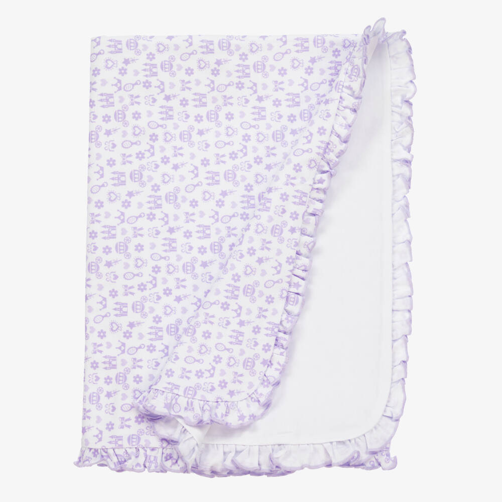 Beautifully comfortable jersey blanket for baby girls by Kissy Kissy. It is made in the softest Pima cotton with a lilac purple print of castles and carriages on a white background. It has pretty ruffled trims, a white lining and is ideal for use in the nursery, car seat or pram.