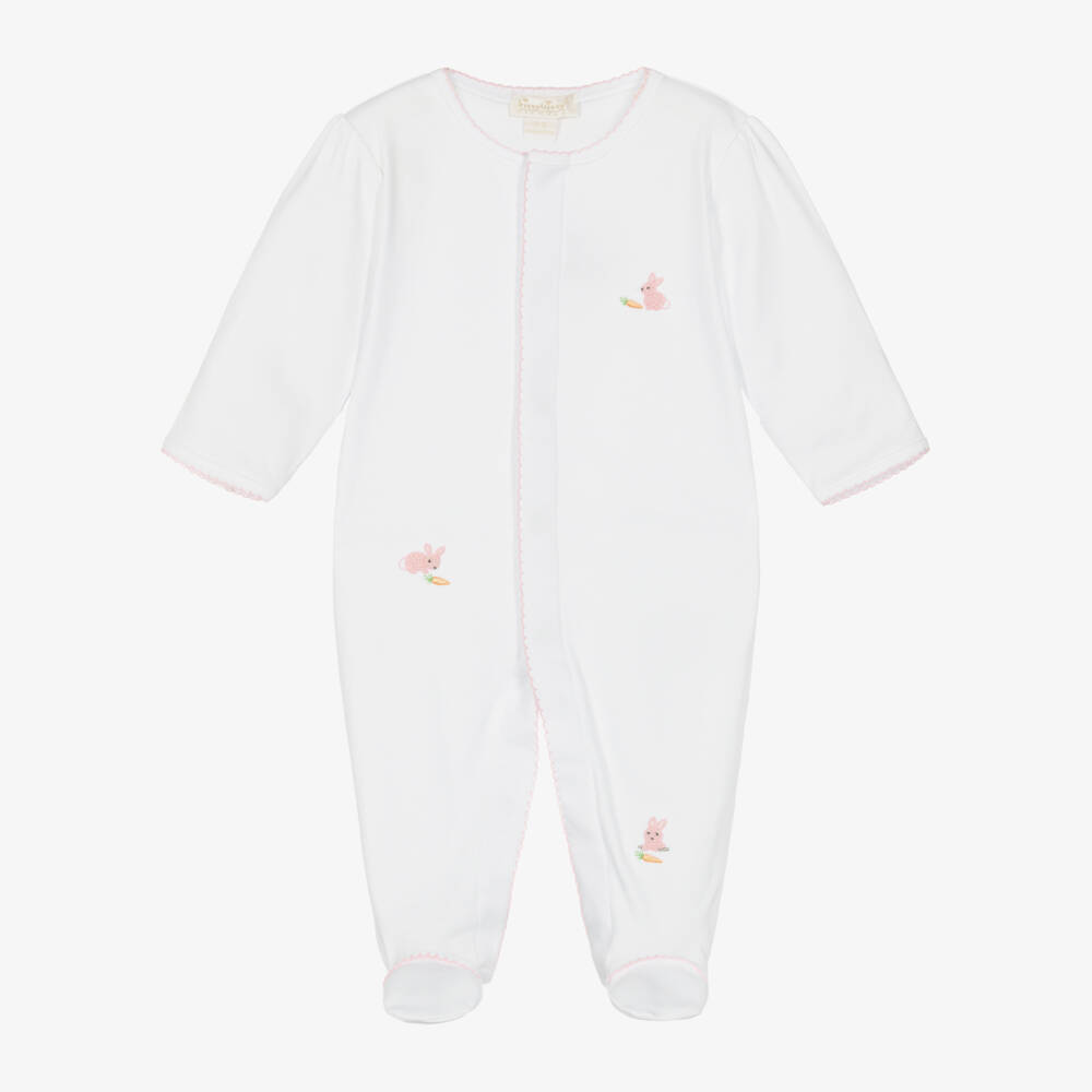 This white babygrow for girls by Kissy Kissy is hand-embroidered with cute little bunny rabbits. Gentle against delicate skin, it is made in soft Pima cotton jersey, with a pink picot trim and front popper fastenings for easy dressing.