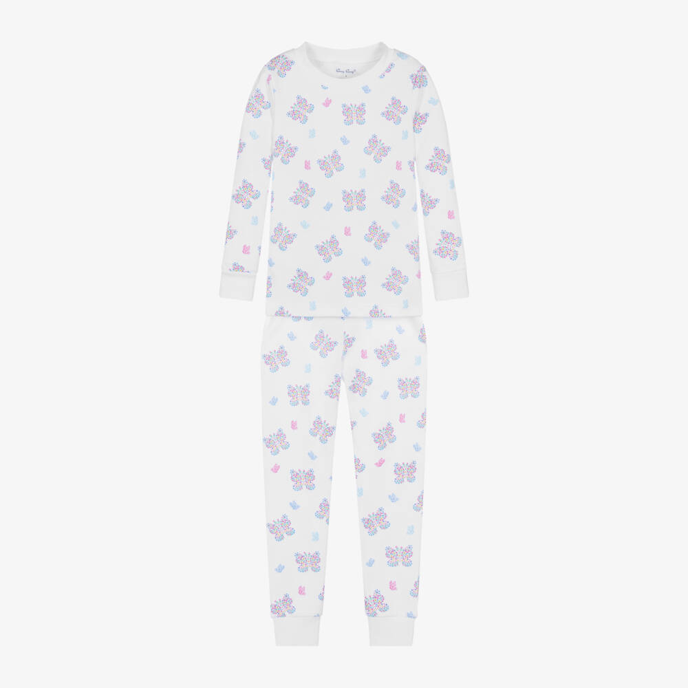 White Pima cotton pyjamas for girls by Kissy Kissy, with a gorgeous floral butterfly pattern in shades of pink, blue and yellow. Beautifully soft, these long-length pyjamas have cosy ribbed trims, and the bottoms have a gently elasticated waistband, just right for a comfortable night's sleep.