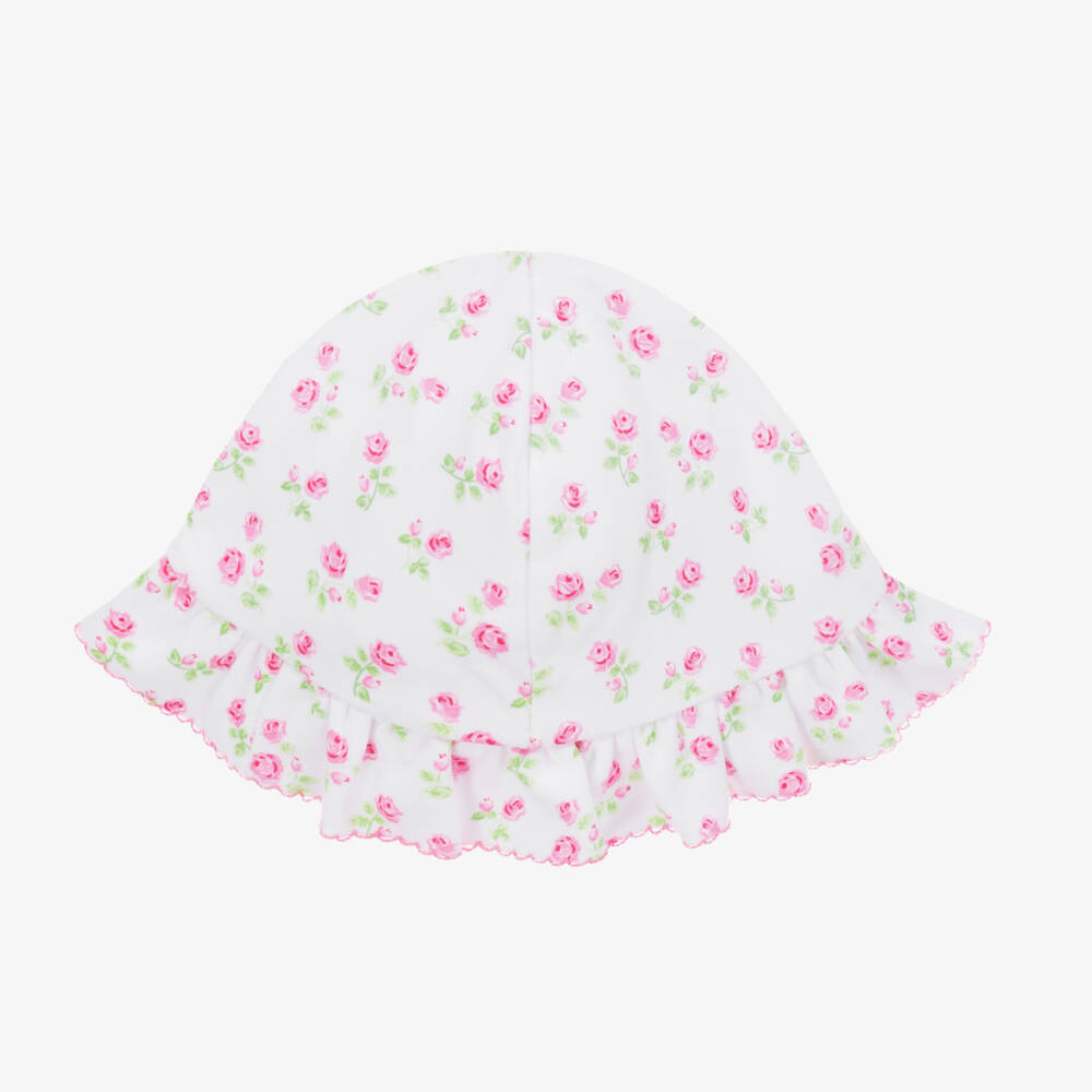 White sun hat for baby girls by Kissy Kissy, patterned in pretty roses in pink and green. Made in a double layer of super soft Pima cotton jersey, it has a frilly brim with a picot embroidery trim.