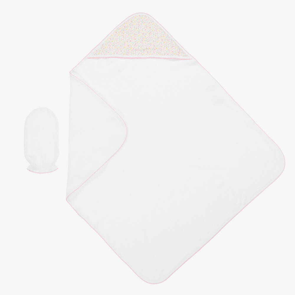 A lovely white hooded towel and mitt set for baby girls by Kissy Kissy with pink picot trim. Made in fluffy cotton towelling, this soft towel is ideal for keeping little ones warm and dry after bath time. It has a pretty ditsy floral print in pink, yellow and green on the hood, and comes with a luxuriously soft wash mitt.