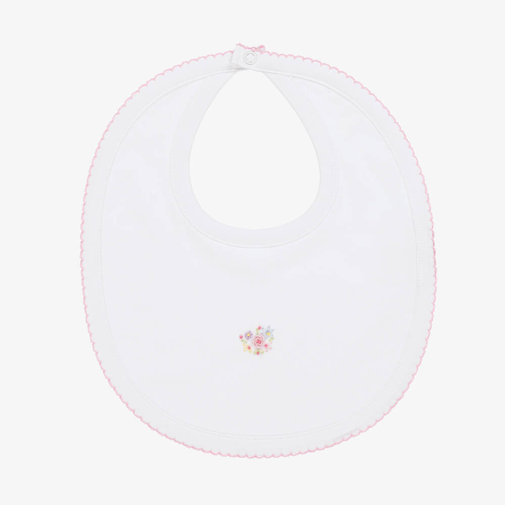 A lovely white bib for baby girls from Kissy Kissy, with a delicate hand-embroidered floral motif on the front. It is made in a double layer of super soft Pima cotton jersey with pretty pink picot trim and a popper fastening.