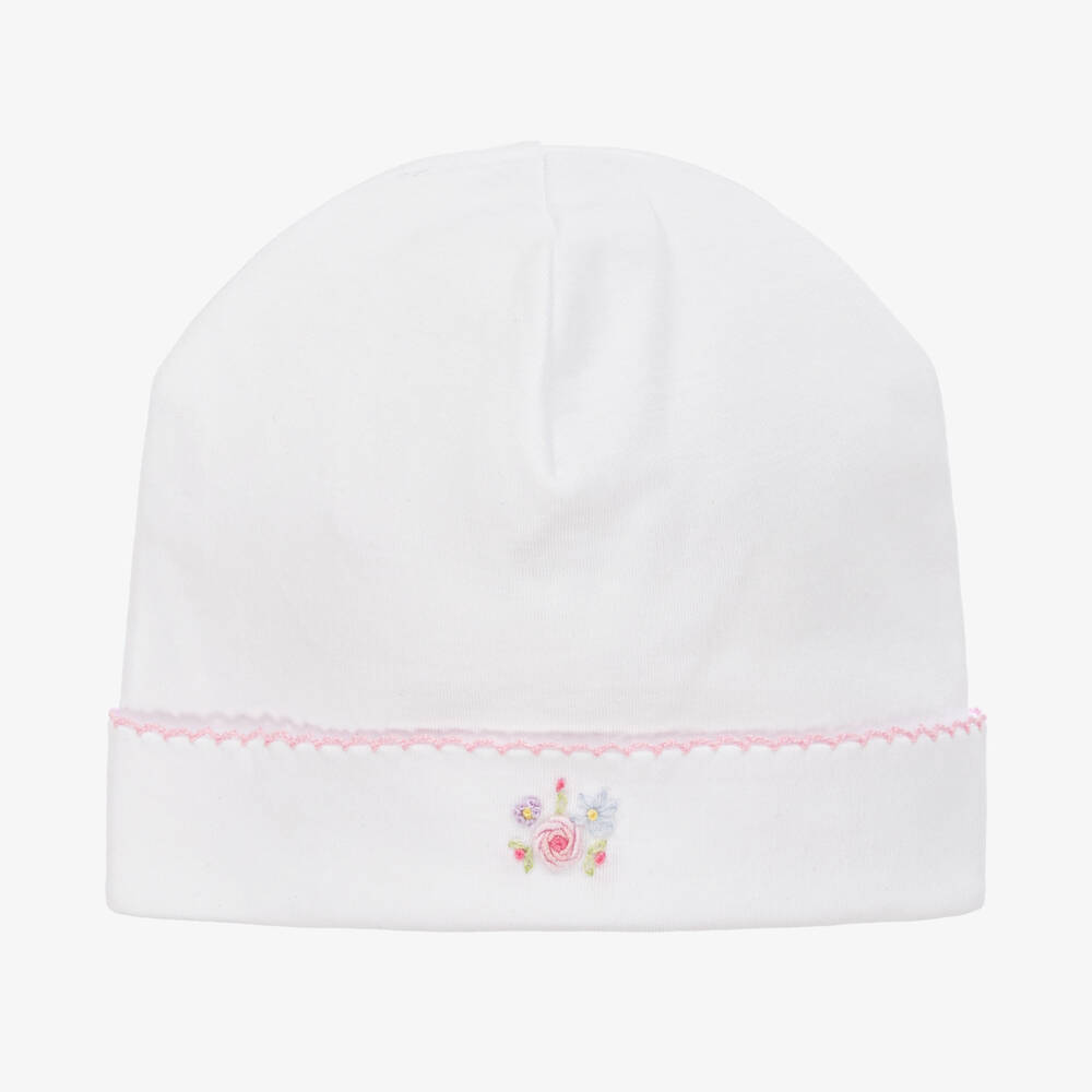 White layette hat for baby girls from Kissy Kissy, made in super soft Pima cotton jersey. This classic style has pink picot trim and a beautiful hand-embroidered floral motif in the turn-up brim.
