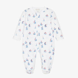 Delightfully soft white babygrow by Kissy Kissy, made in Pima cotton jersey. It has beautifully hand-embroidered pink flower detailing and scalloped hand-knitted pink trims for a sweet touch. It fastens with poppers for ease of dressing.