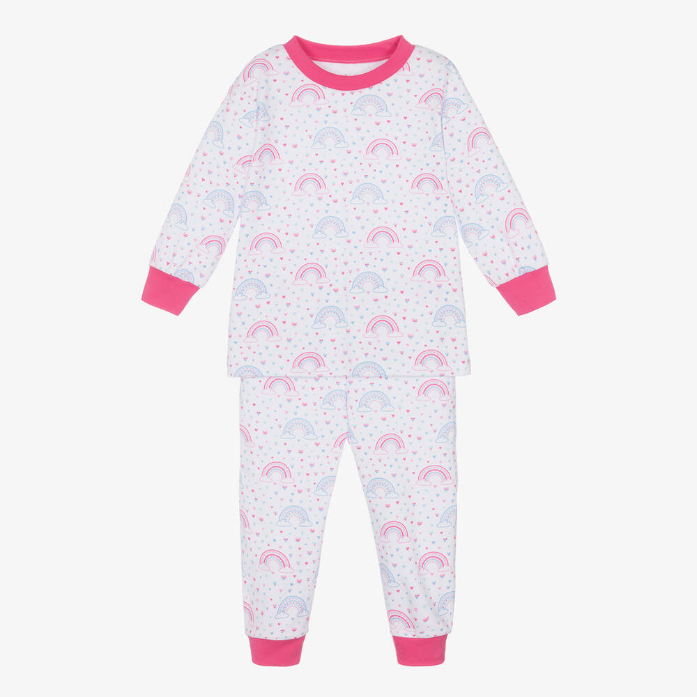 Cute white pyjamas for girls by Kissy Kissy, made with comfortable and gentle-to-the-skin Pima cotton jersey. They are patterned with adorable pink and blue rainbow and heart motifs. Both the long-sleeved top and bottoms have finely ribbed trims and cuffs for added bedtime cosiness.