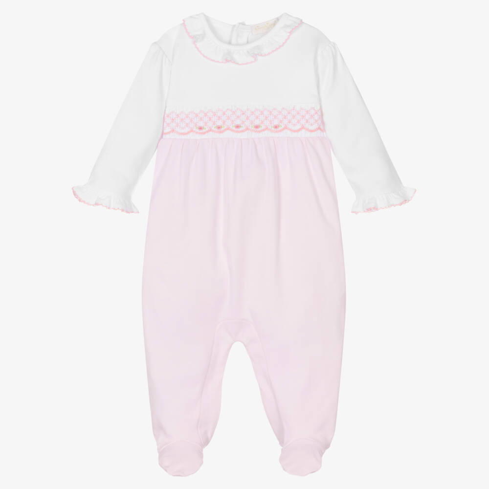 Sweet white and pink babygrow for girls, by Kissy Kissy. Made in luxuriously soft Pima cotton jersey, it has a pink traditional hand-smocked panel across the front with delicate rose embroidery. Trimmed with pink picot details, it fastens with poppers on the back and between the legs for easy dressing.
