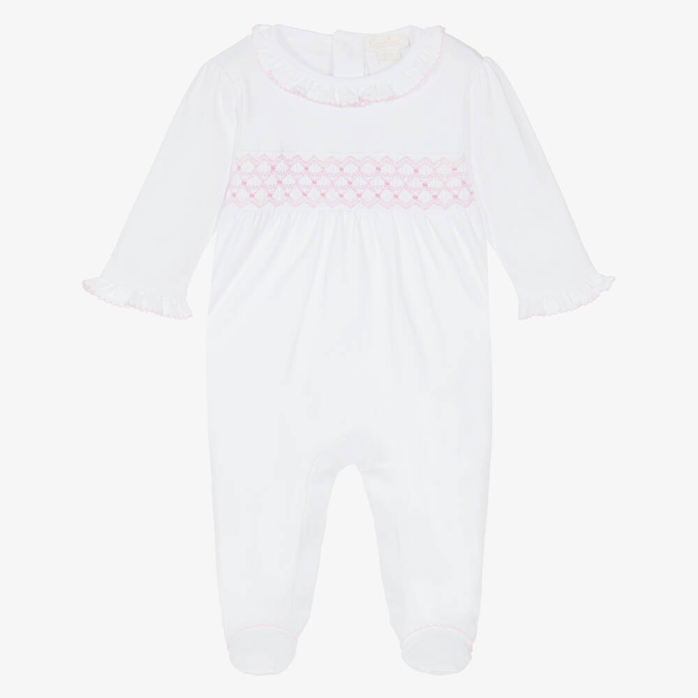A white babygrow for boys by Kissy Kissy, made in beautifully soft Pima cotton jersey. It has pretty frills with picot trims and a traditional hand-smocked panel with pink embroidery for a sweet look. There are popper fastenings on the back and between the legs.