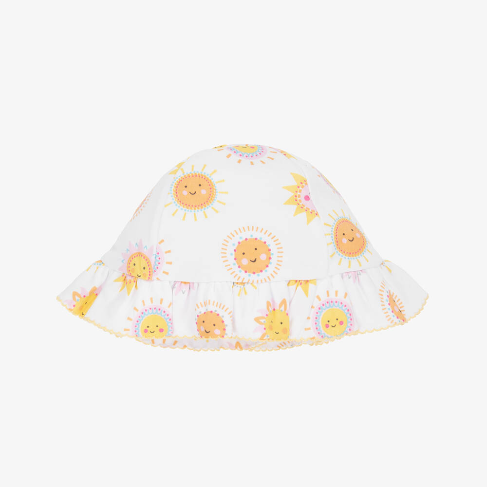 Exclusive to Childrensalon, a sweet white sun hat for baby girls by Kissy Kissy, patterned with happy sunshine faces in orange, yellow and pink. Made in a double layer of super soft Pima cotton jersey, it has a pretty frilled brim with delicate yellow picot trim.