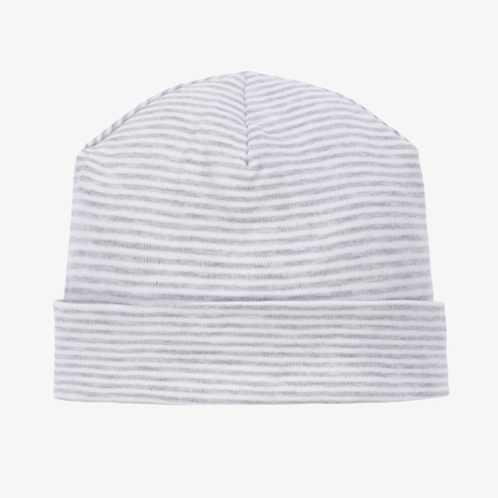 A sweet grey and white striped hat for baby boys and girls from Kissy Kissy. Made in a double layer of the softest Pima cotton jersey, with a turned up brim.