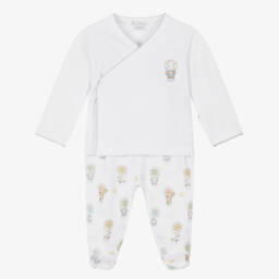 White two piece babygrow for boys and girls by Kissy Kissy, made in super soft, stretchy Pima cotton jersey. The top is patterned with cute grey sheep and has a crossover front fastening with poppers. Smaller sizes have fold-over scratch mitts. The bottoms have a lovely grey star print and an elasticated waist for comfort.