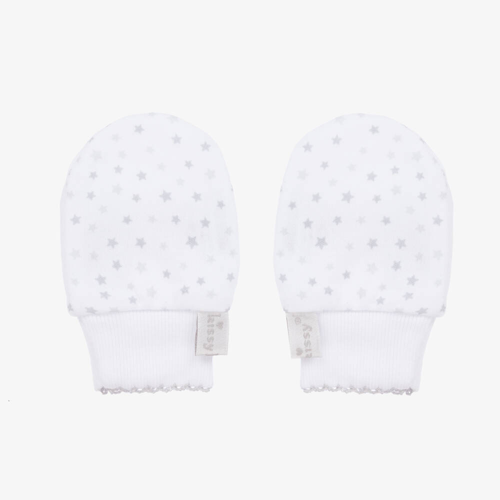 White scratch mittens for baby boys and girls by Kissy Kissy, made from wonderfully soft Pima cotton jersey. Easy to slip on, they are patterned with little grey stars and trimmed with delicate picot embroidery.