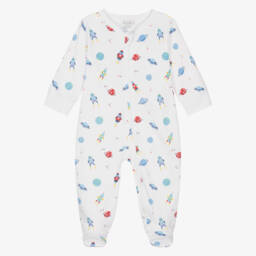 Fun white babygrow for boys and girls by Kissy Kissy, with a playful Halloween-themed pattern in orange, yellow and black. It is made in beautifully soft Pima cotton jersey with orange ribbed trim and has a long zip fastening on the front with a chin guard for comfort. Smaller sizes come with useful fold-over scratch mitts.