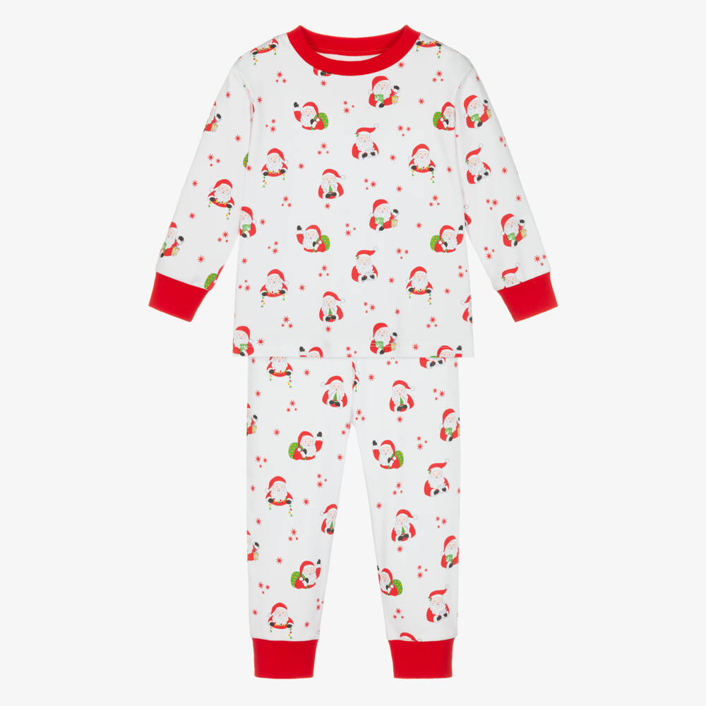 Lovely for boys and girls, a pair of festive pyjamas from Kissy Kissy, in white with jolly Santas and stars patterned in red. Made in beautifully soft Pima cotton jersey for a comfortable night's sleep, they have red ribbed trims and the waistband is gently elasticated.
