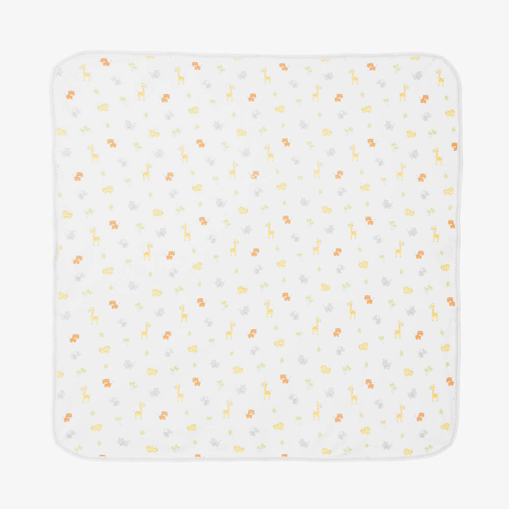 Cute white blanket for baby boys and girls by Kissy Kissy, made in super soft Pima cotton jersey. It has sweet grey embroidered trims and a colourful jungle animals print, for a playful touch.