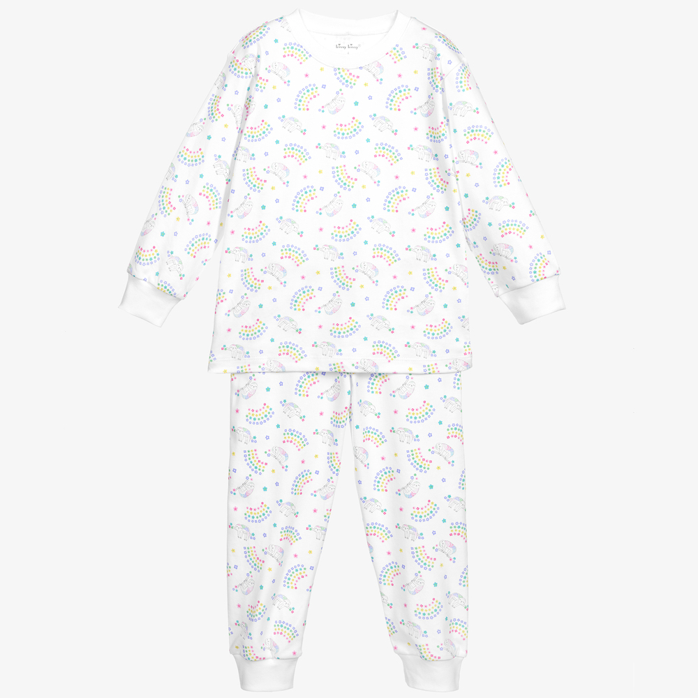 White long pyjamas for girls by Kissy Kissy, made in soft and stretchy Pima cotton jersey, with a cute colourful sloth print.