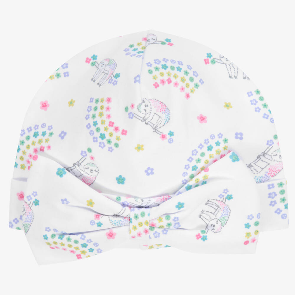 Cute white hat for baby girls by Kissy Kissy. Made from beautifully soft Pima cotton, it has a sweet sloth and rainbow design, with a lovely bow.