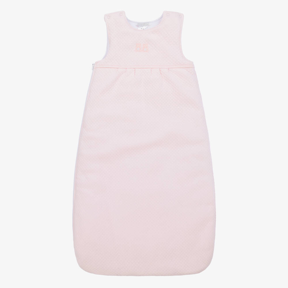 Light pink sleeping bag for baby girls by Kissy Kissy, made in gentle Pima cotton with a diamond quilted effect. Both cute and practical for baby's bedtime routine, this sweet sleeping accessory is embroidered with pink teddy bears on the front. It is padded for softness and comfort with a 3.0 Tog rating. There is a zip fastening down one side and popper fastenings on the shoulder straps.