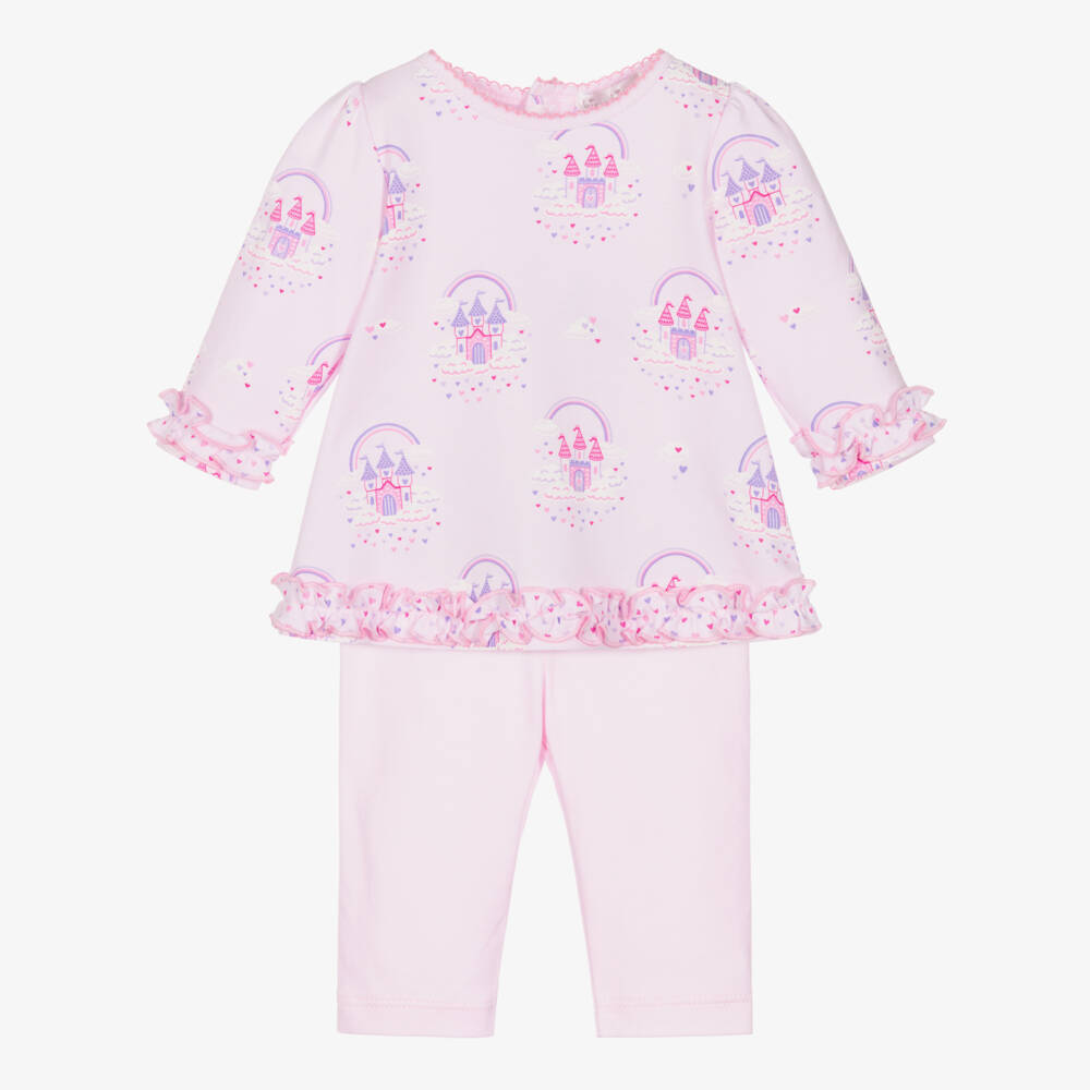 A fun pink leggings set for baby girls by Kissy Kissy, made in soft and stretchy Pima cotton jersey. The long-sleeved top has a girly castle in the clouds print with dainty love hearts and cute rainbows. It has sweet puff sleeves and ruffle trims on the cuffs and hem. There are popper fastenings on the back and a delicate picot trim on the neckline. The matching leggings come in plain pink and have an elasticated waist for added comfort.