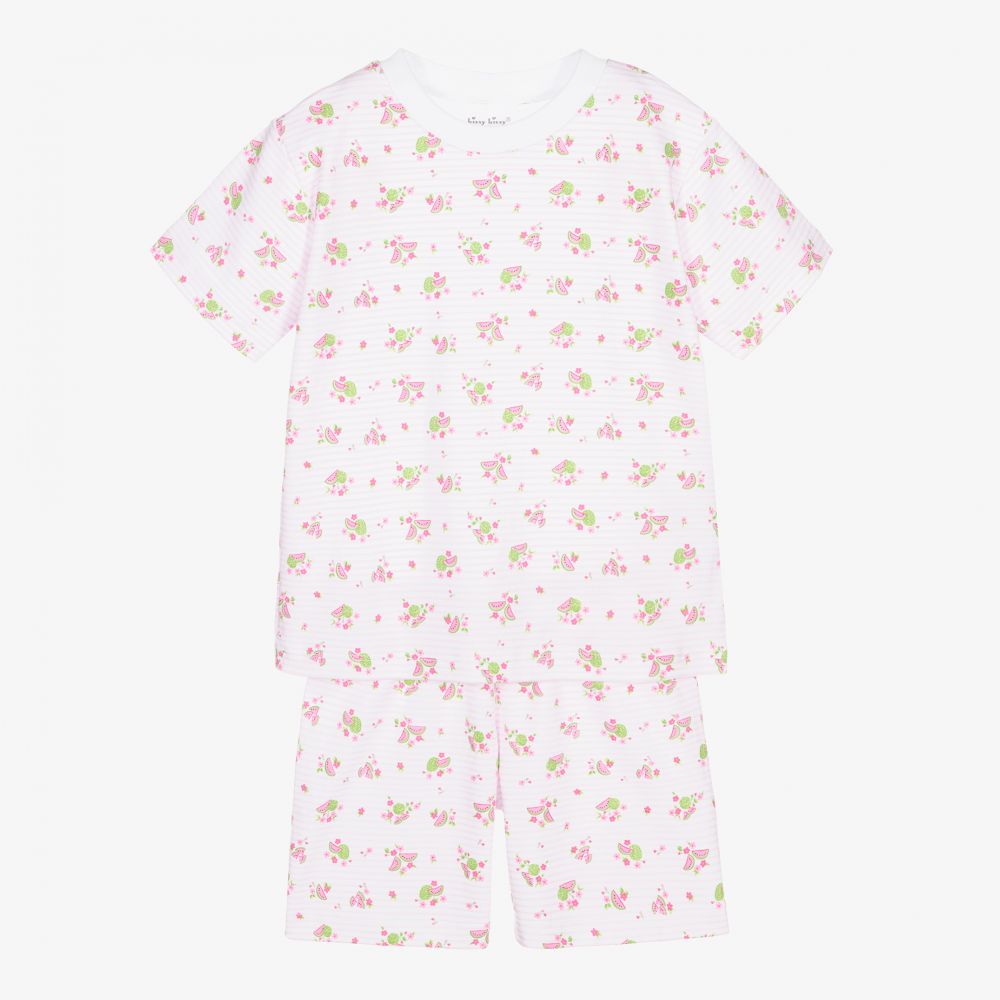 White and pink striped short pyjamas for girls by Kissy Kissy, made in super soft and stretchy Pima cotton jersey. They are printed in a lovely pink and green watermelon pattern with a white, ribbed neckline.