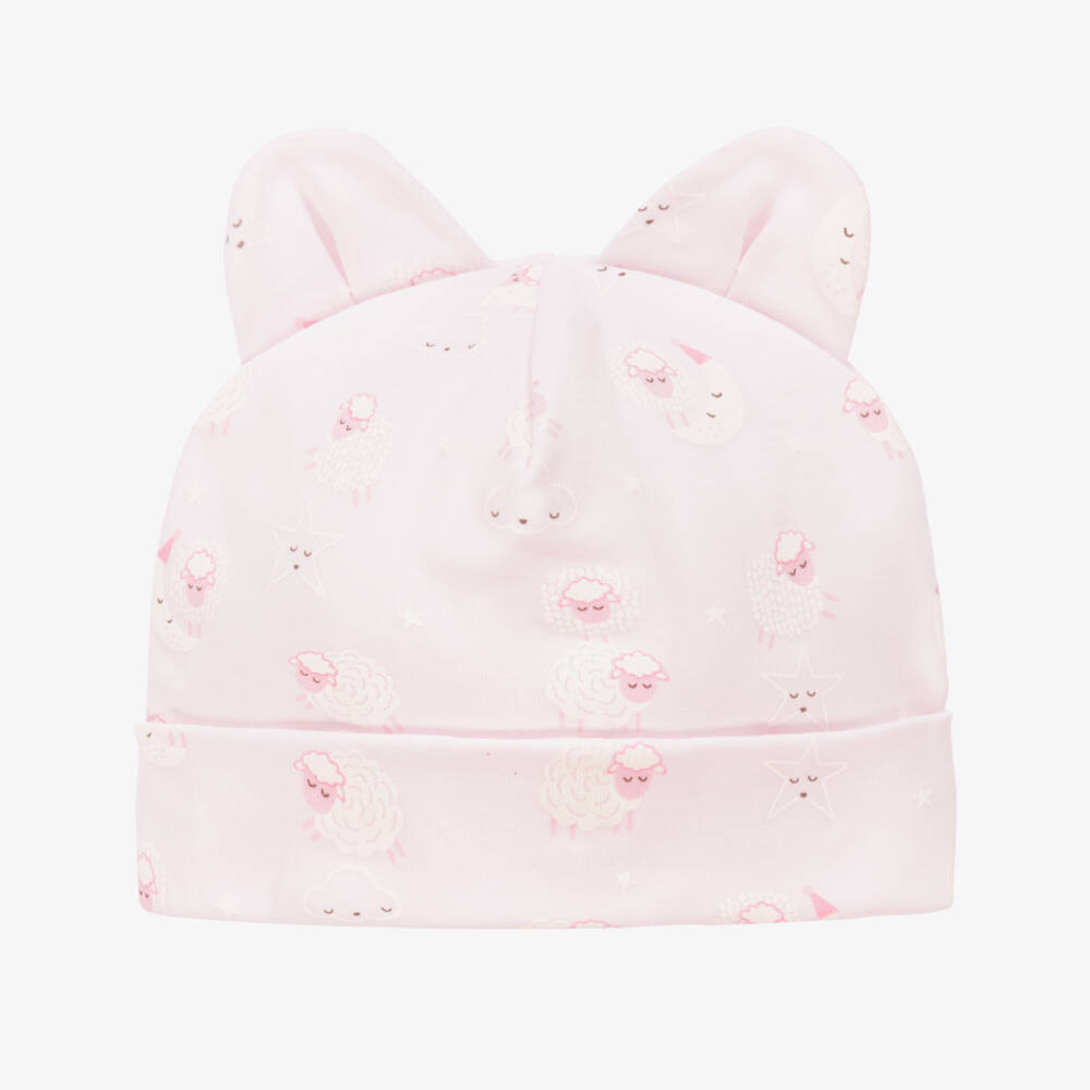 Delightful pink hat for baby girls from Kissy Kissy. Made in super soft Pima cotton jersey, it is comfortable against delicate skin. It has a white print of sleepy lambs and 3D ears on the top for a sweet finish.