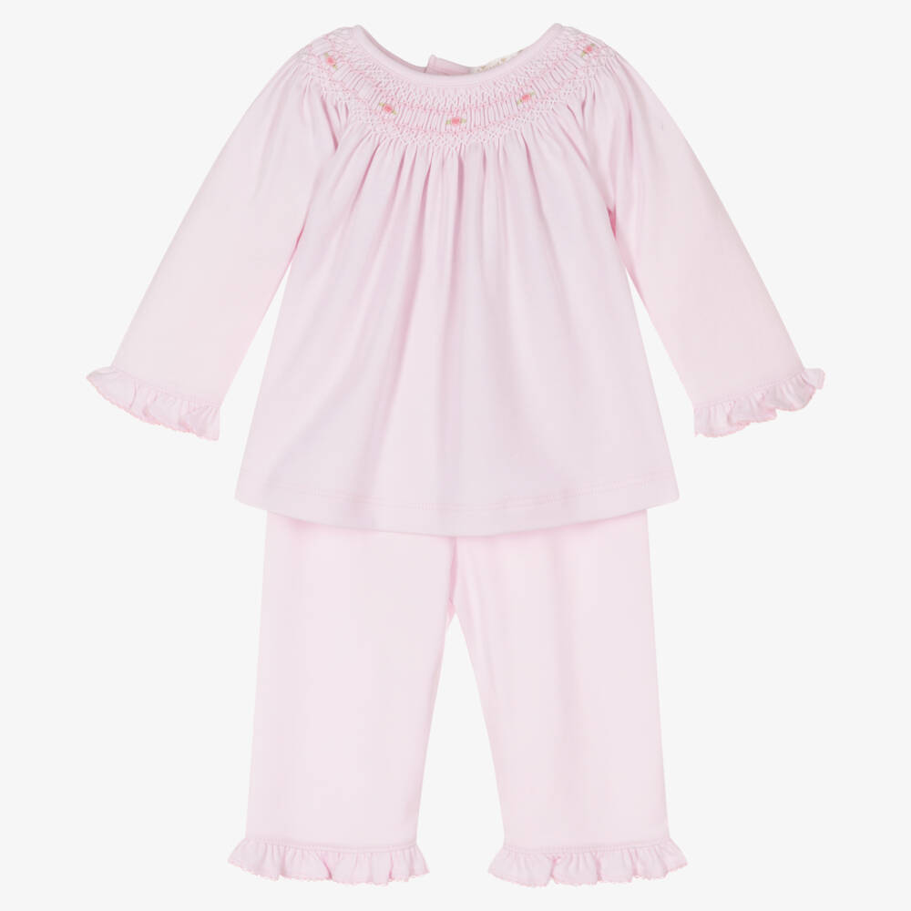 A pale pink trouser set for baby girls by Kissy Kissy. Ideal for delicate skin, this sweet two-piece is made in luxuriously soft Pima cotton jersey. The top has a dainty hand-smocked neckline with delicate rose embroidery and frill cuffs. It fastens with poppers on the back for easy dressing. Matching ruffle-trimmed bottoms complete this coordinated set, which are gently elasticated at the waist for comfort.