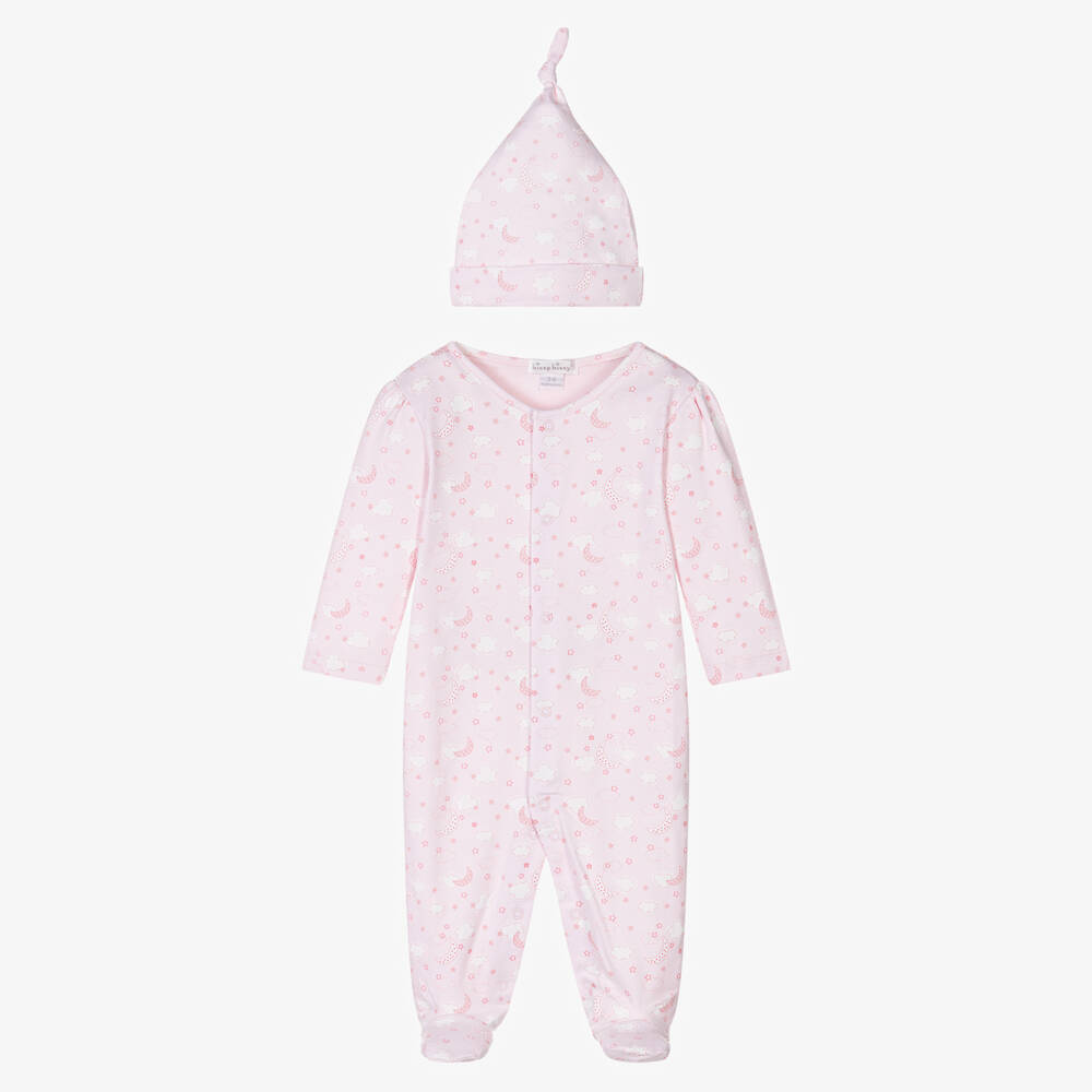 A pale pink babygrow set for girls by Kissy Kissy, made in luxuriously soft Pima cotton jersey. This lovely set has a white moon, star and cloud design. The babygrow has easy-to-fasten poppers on the front and pairs beautifully with the matching layette hat.