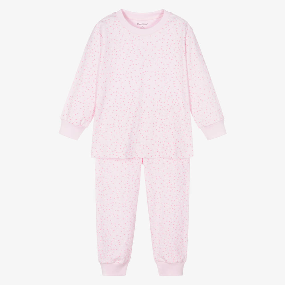 Girls pink pyjamas with a pink and white heart pattern by Kissy Kissy. Made in super soft Pima cotton jersey, they have comfortable, ribbed cuffs.