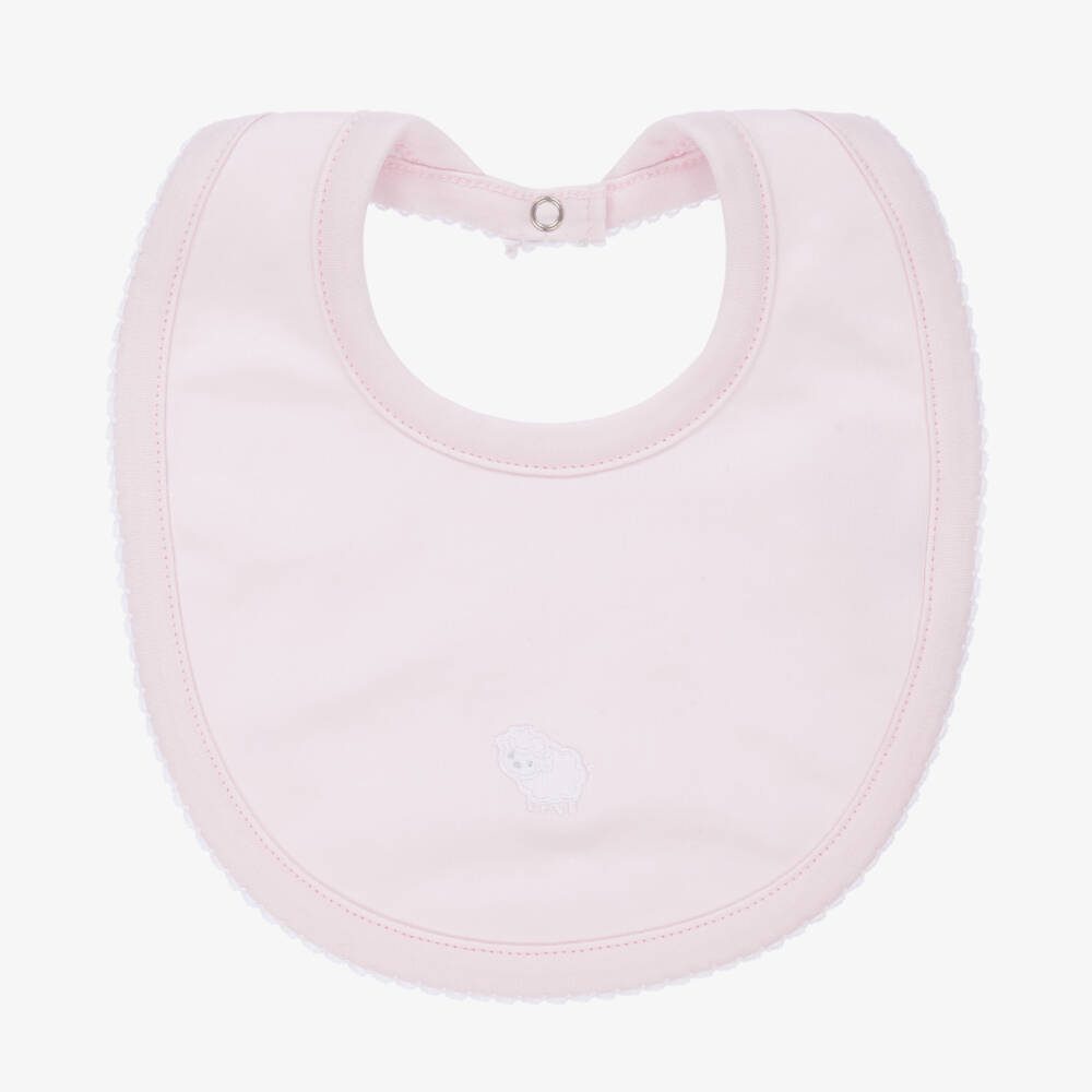 Pink bib for baby girls by Kissy Kissy. The front is made in soft Pima cotton jersey, with a cute white lamb appliqué and white picot embroidered trims. The reverse is made in soft, absorbent cotton towelling and there is a popper fastening on the back.