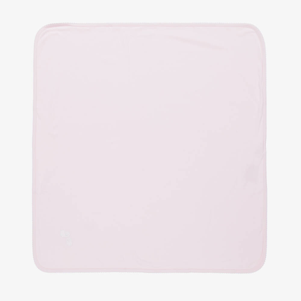Pale pink blanket for baby girls by Kissy Kissy, made in a double layer of super soft Pima cotton jersey. It has a cute embroidered sheep appliqué in white on one corner and white picot embroidered trims. A versatile nursery accessory, it can be used to wrap around baby or when out and about in the pram or car seat.