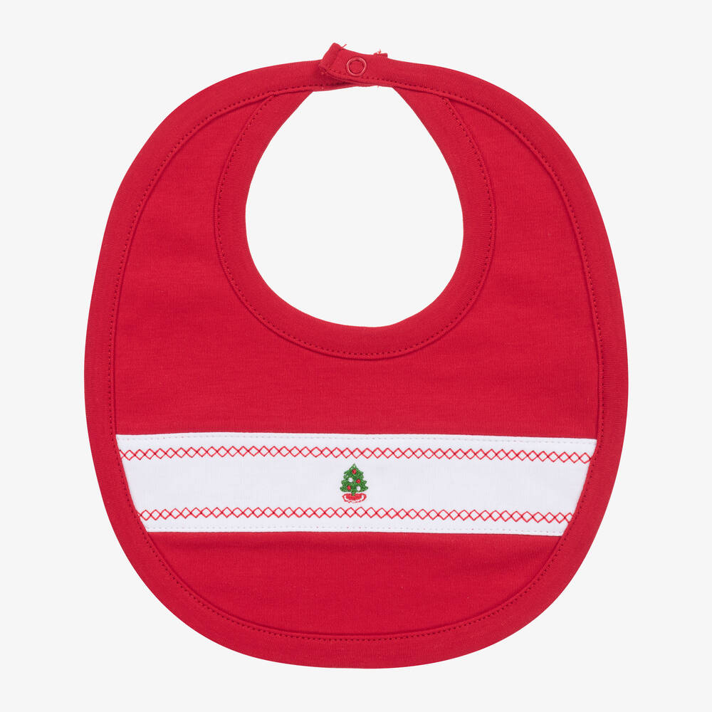 This red bib for baby boys and girls by Kissy Kissy would make a lovely choice to celebrate the festive period. Made in super soft, double-layered Pima cotton, it has a white band with Christmas tree embroidery on the front. There is an easy-fastening popper on the back.