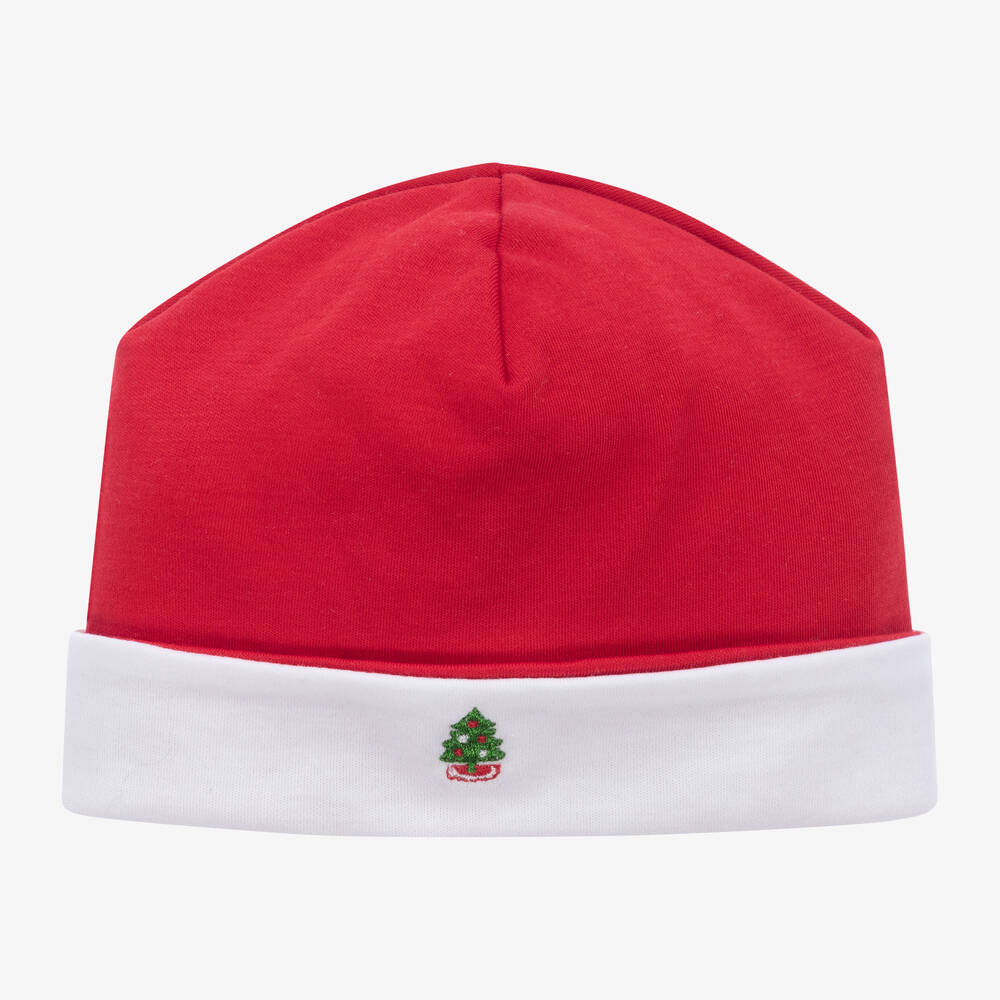 Baby boys and girls will look extra festive in this cute red hat by Kissy Kissy. Made in a double layer of soft Pima cotton, it has a white brim for that classic Santa Claus look and a little embroidered Christmas tree on the front.