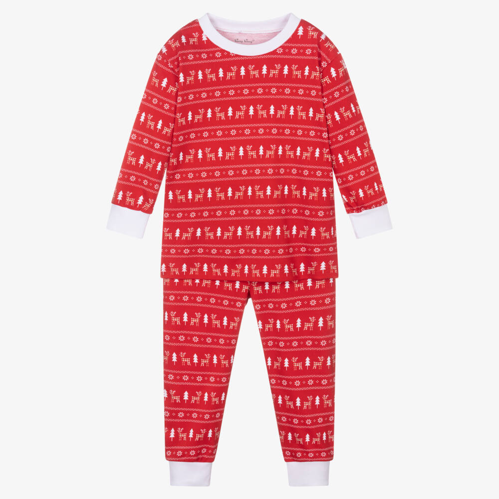 Festive red pyjamas for boys and girls from Kissy Kissy, with a lovely white reindeer, tree and snowflake pattern. They are made in super soft Pima cotton jersey with white ribbed trims for cosy wear and a gently elasticated waistband for a comfortable night's sleep.