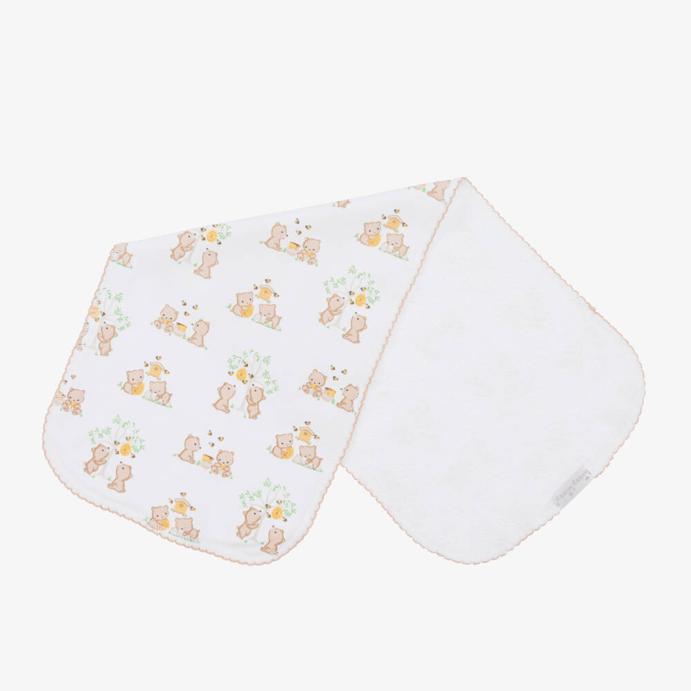 White burp cloth for baby boys and girls by Kissy Kissy, with an adorable bear cub and bee hive pattern. This useful feeding accessory can be placed over your shoulder when burping baby. It is made in soft Pima cotton jersey and lined in absorbent towelling.