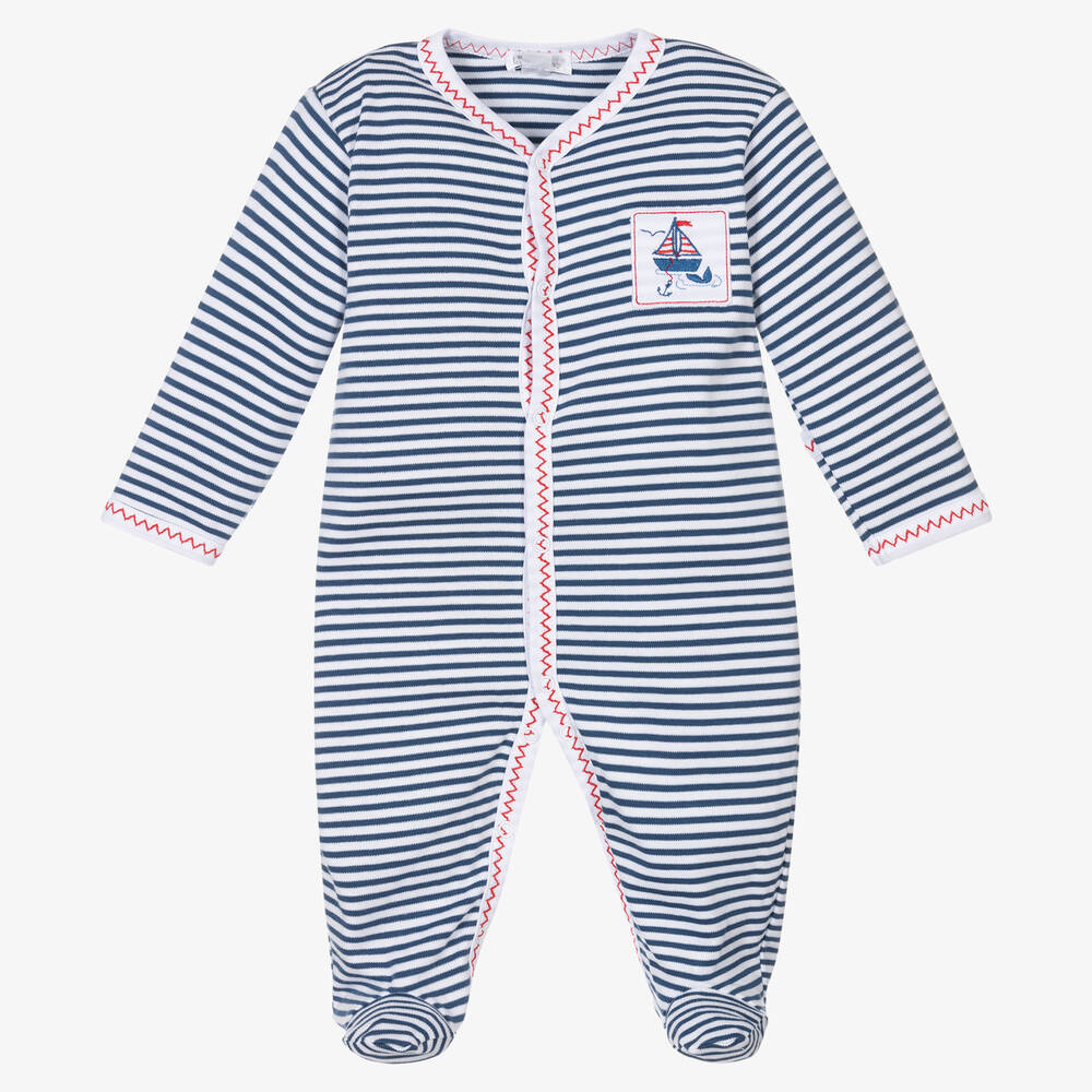 Navy blue and white striped babygrow for boys and girls by Kissy Kissy, made in super soft Pima cotton jersey. It has red zigzag stitching on the white trims and a white chest patch with a sweet embroidered boat and whale motif. It fastens easily with poppers on the front and smaller sizes have useful fold-over scratch mitts.