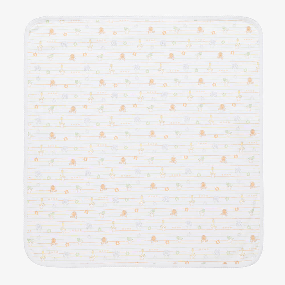 White blanket by Kissy Kissy for baby boys and girls. It is made in a double layer of super soft Pima cotton jersey, with a jungle animal print in green, orange and yellow.